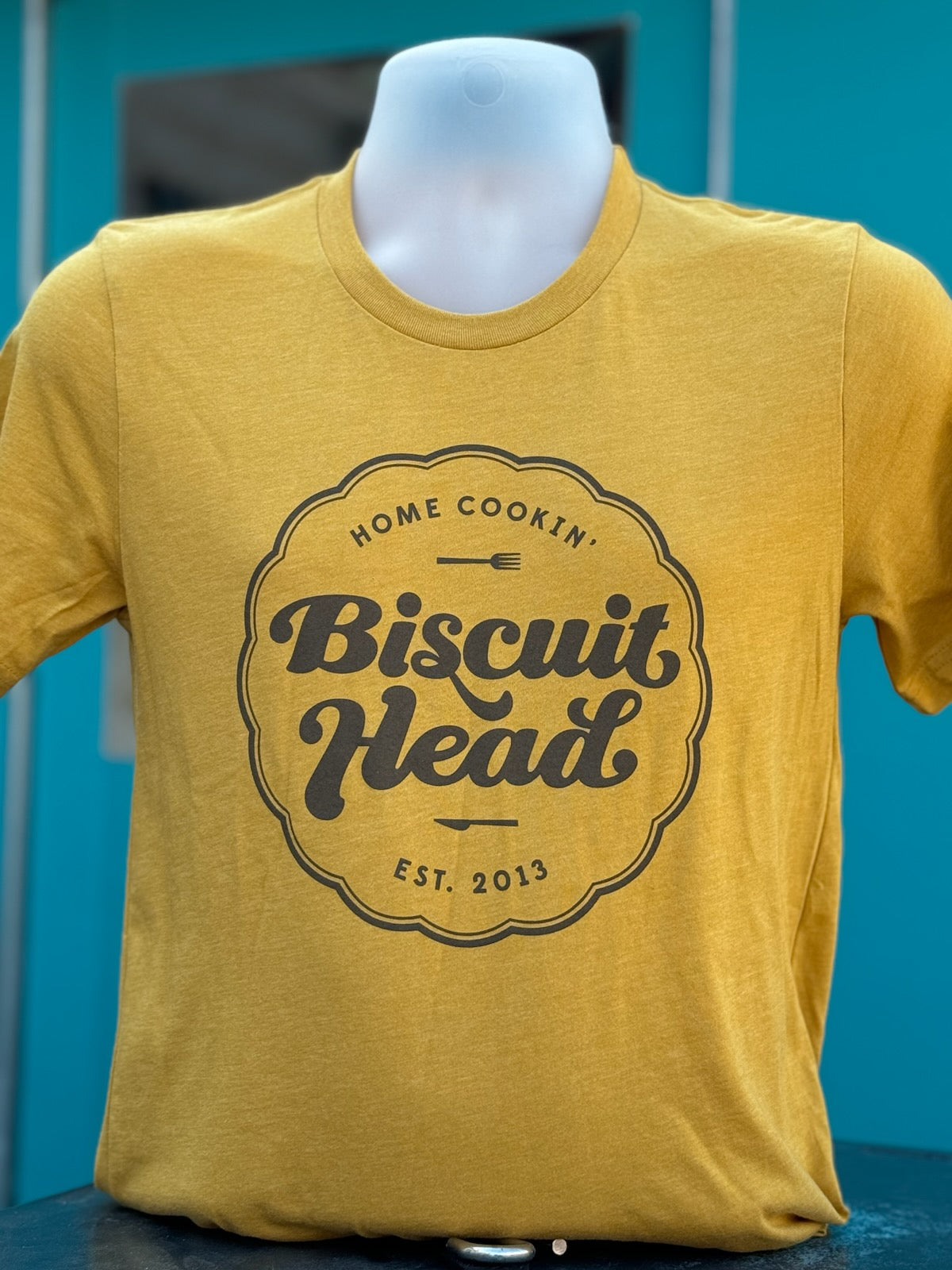 Lightweight adult mustard yellow tee and center logo.