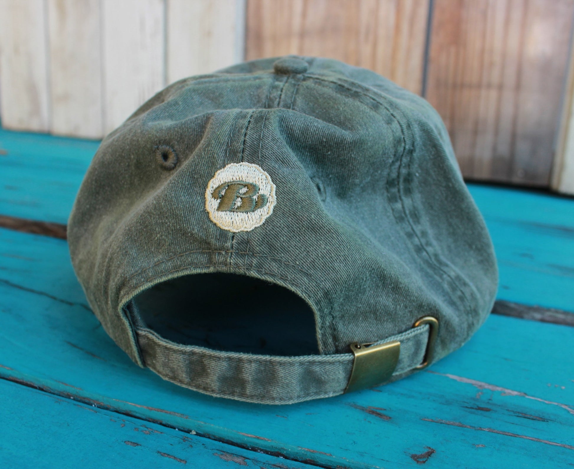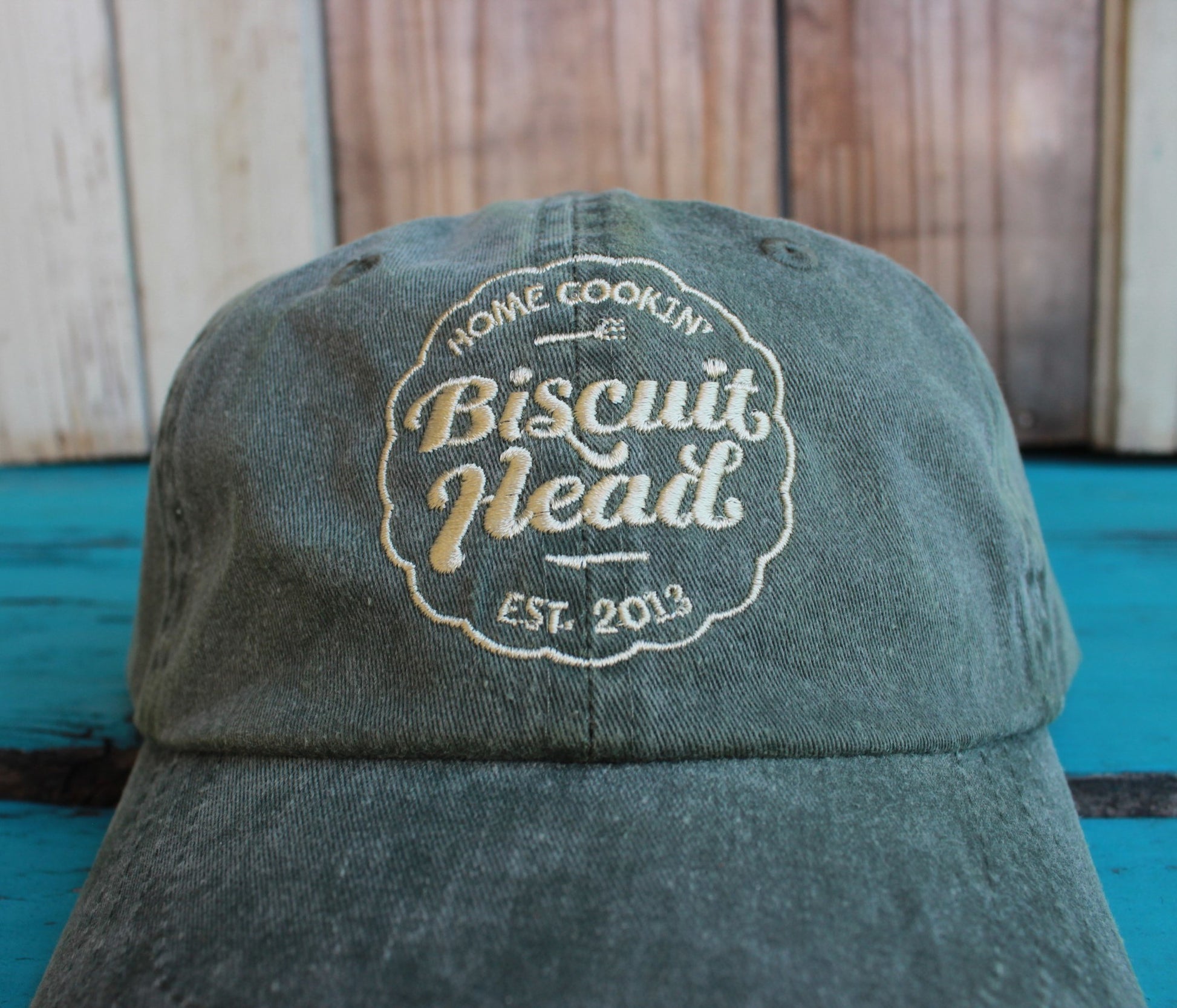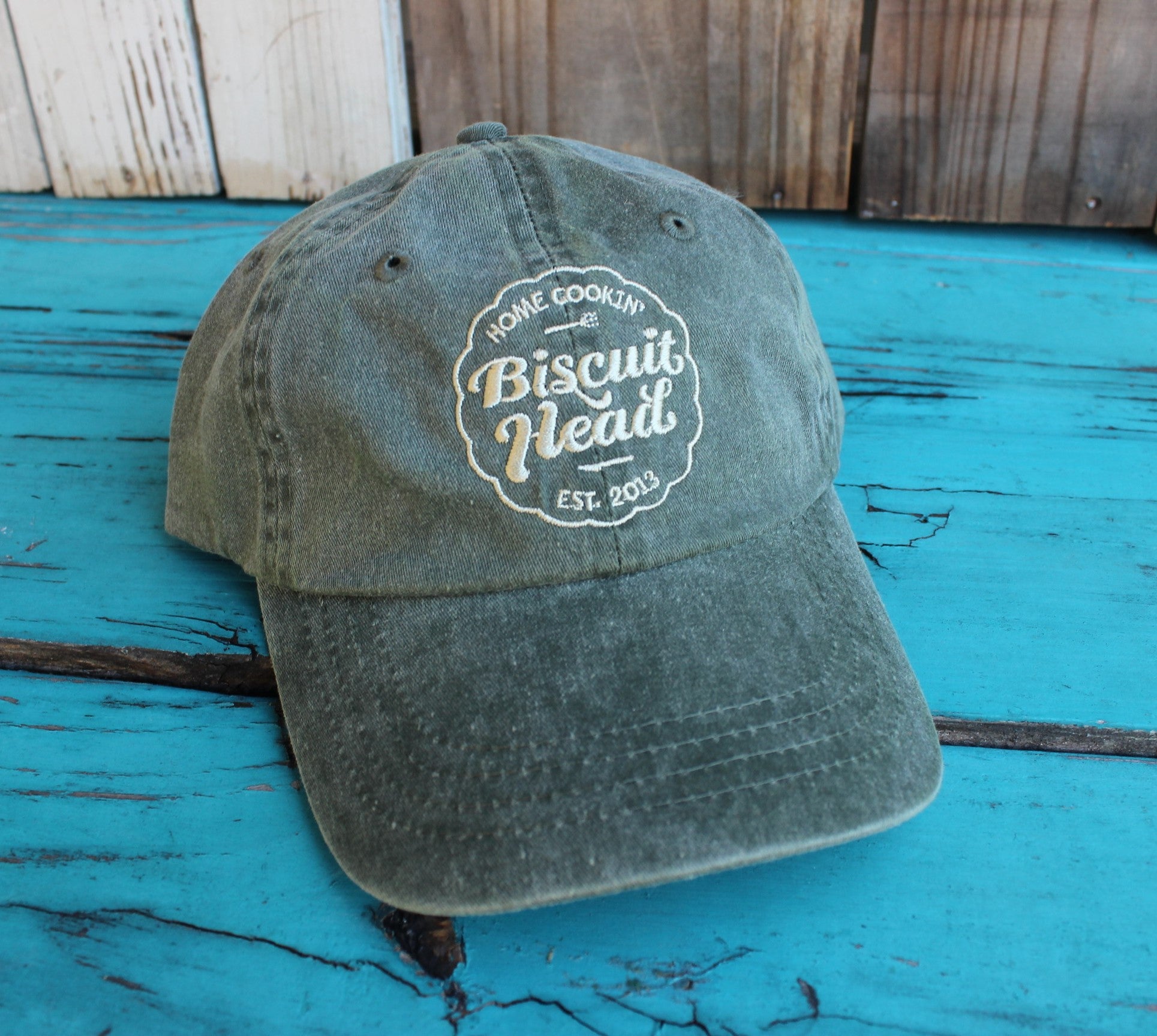 Put on a Biscuit Head Dad hat and get ready to crack some dad jokes. This olive drab (green-gray) hat has a denim wash, is 100% cotton twill and has our Biscuit Head logo embroidered on the front as well as a B embroidered on the back.
